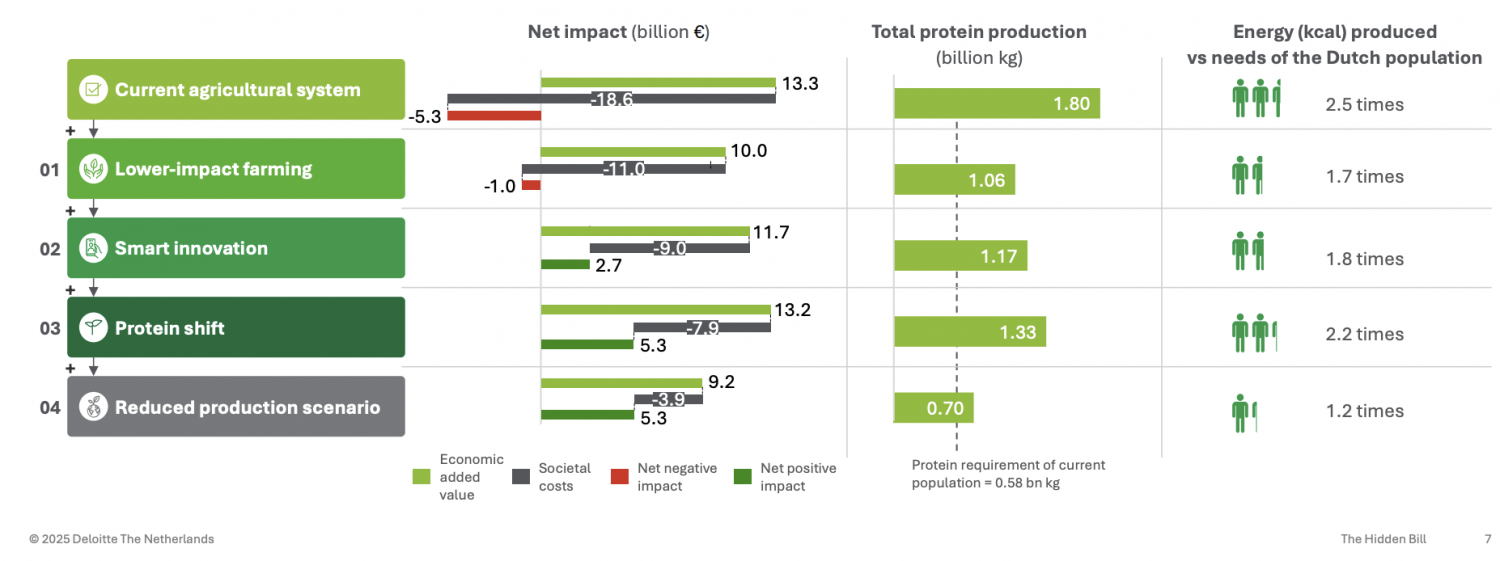 Uit het onderzoek The Hidden Bill: Reshaping Dutch Agriculture blijkt dat de landbouw een toegevoegde waarde heeft van €13,3 miljard, terwijl de maatschappelijke kosten oplopen tot €18,6 miljard per jaar. Deze kosten worden veroorzaakt door onder andere broeikasgasuitstoot, stikstof en ammoniak, verlies aan biodiversiteit en effecten op waterkwaliteit en gezondheid.